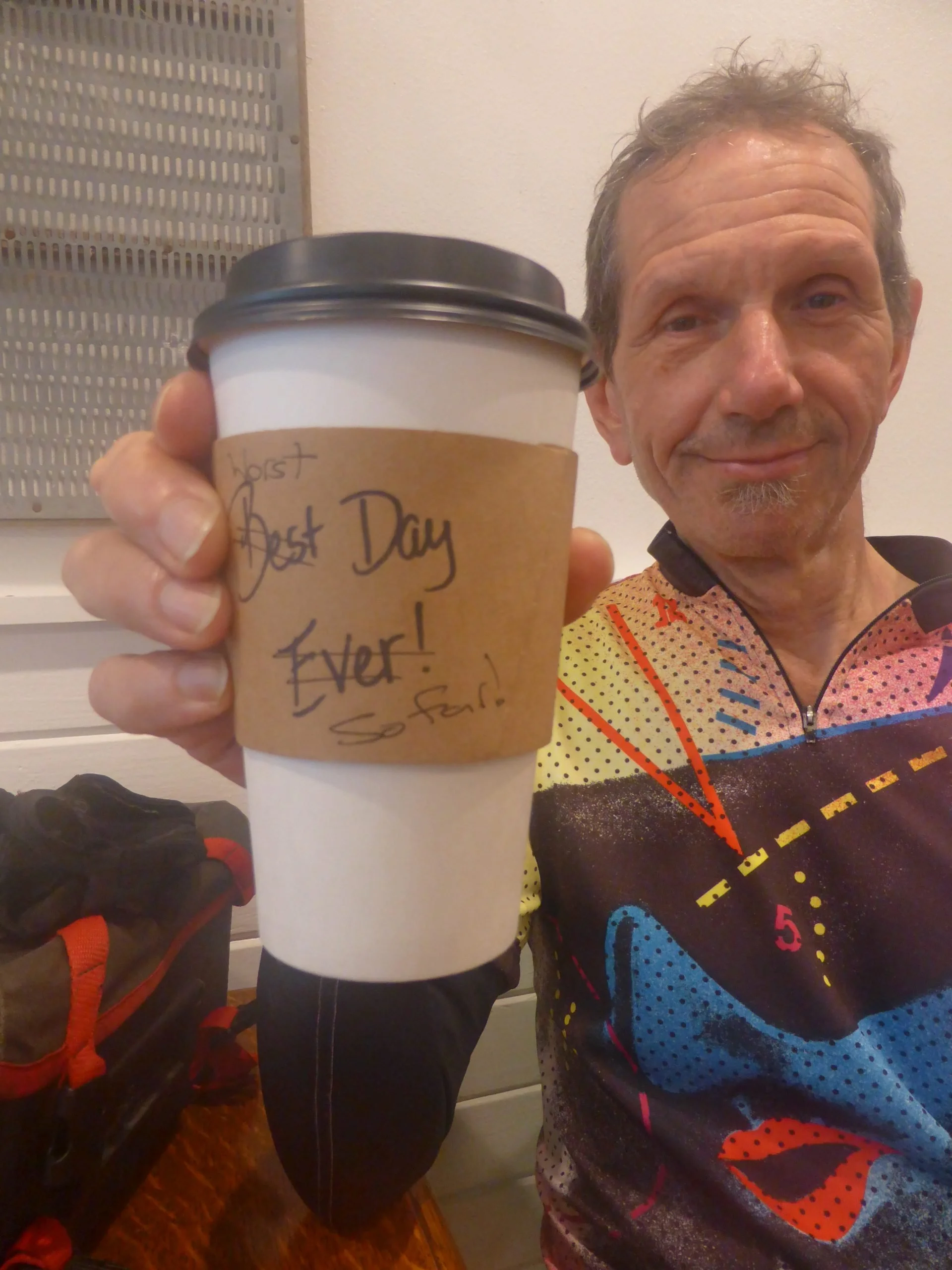 Inside they were doing a roaring trade and spotting the word 'breakfast' on the board we were already imagining tucking into a bowl of hash browns until we noticed there was a word underneath - smoothie. WTF! Smoothies in rural Texas - how can a cowboy round up his herd on a smoothie! Nevertheless they did serve the best lattes we'd had in America and the orange-infused biscuit I had was divine, although a lack of veggie options (the biscuits were made with lard) meant Terry went hungry. The cardboard sleeve around his coffee read ‘Best Day Ever’ which he altered to ‘Worst Day So Far’. Ok, so our third attempt at breakfast would now be in another 20 miles.