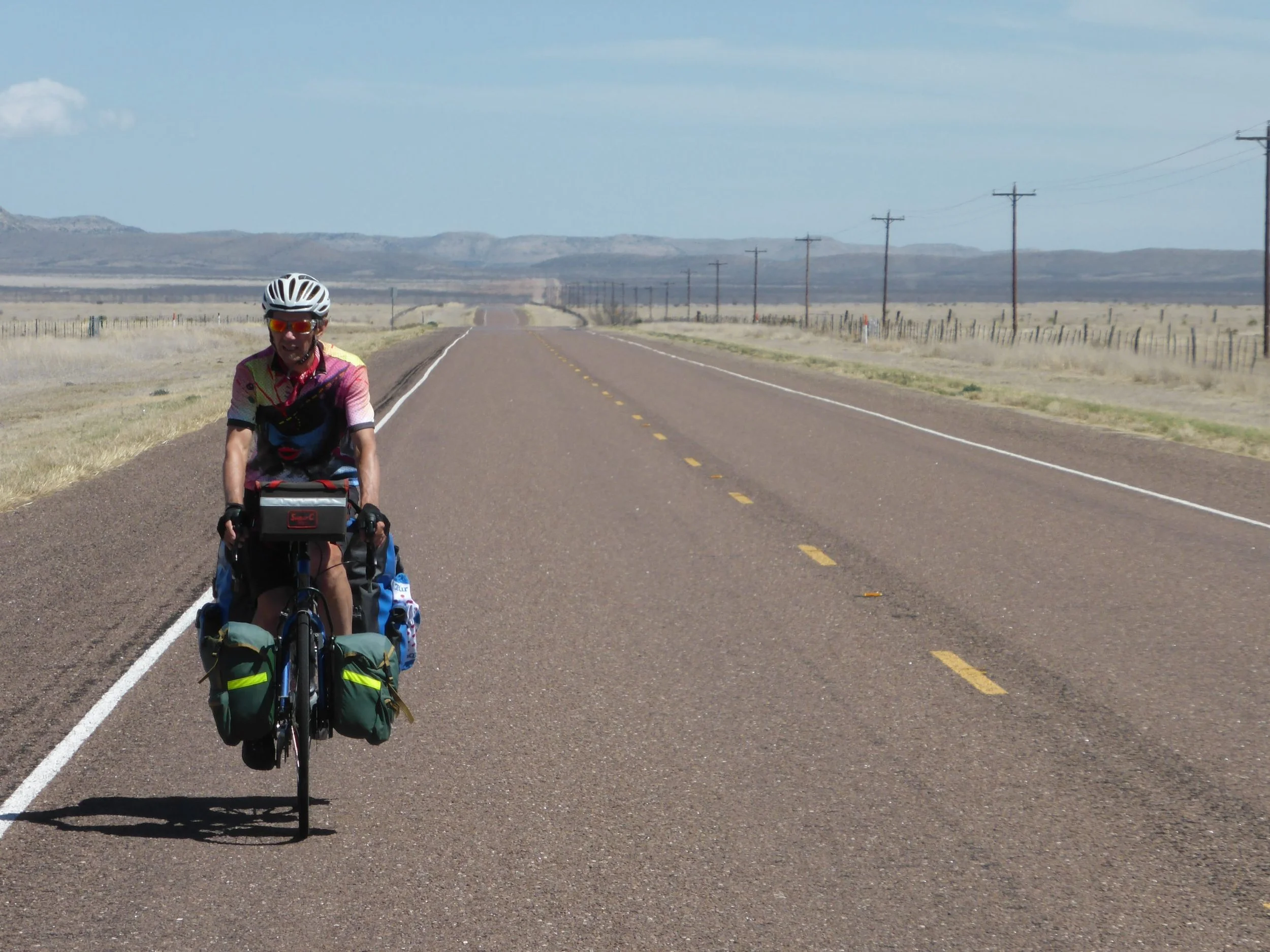 Eventually, we all left Sanderson together, filming each other as we cycled out of town. As we were doing our nominal 60 miles today and our new best friends were doing 120 (to make up the time they'd lost waiting to see us), they soon disappeared into the cool, misty distance and onward to their record.