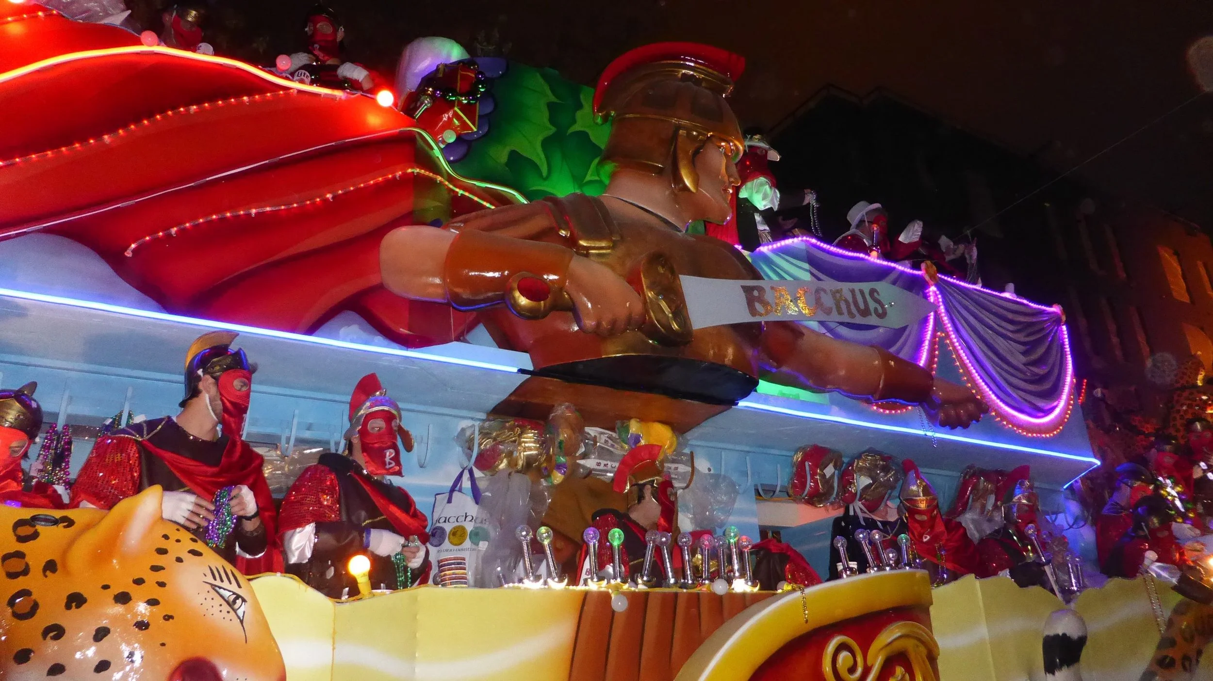 This was excess writ large and the crowds were loving it as they called and reached out for ever more stuff, much of which fell into the gutter and was lost underfoot. We were passed by Roman soldiers on horses, marching bands wearing white-plumed helmets with so many sousaphone players it was hard to count them all and a enormous alligator, the Bacchagator, which is an annual feature of the Bacchus extravaganza.