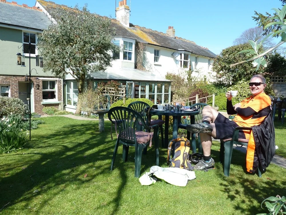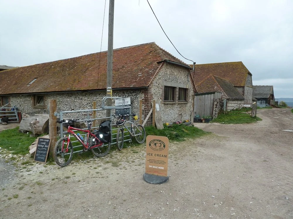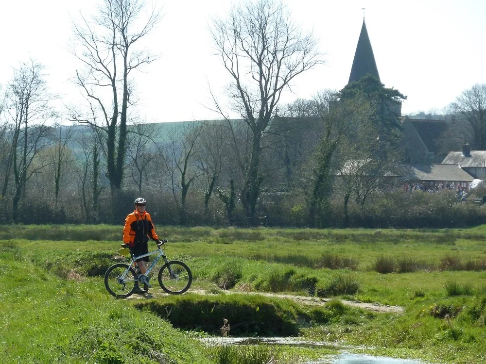 On arriving in Jevington we found a pretty little tea-room so we sat sipping tea and coffee just a few miles into our journey in a sunny garden surrounding by bird-feeders and clinking tea-cups. Could there be a more British scene? Then it was more hill climbing onto the village of Alfriston where we had stayed last year on the London to Paris run. We approached across the water- meadows along side the Cuckmere River, although it is more like a stream at this point. Great view of the church overlooking the floodplain with some kind of fete well underway in the church yard. It reminded me more of France than the UK. A very pretty village and an inviting pub in the High Street, but decided we should push on.