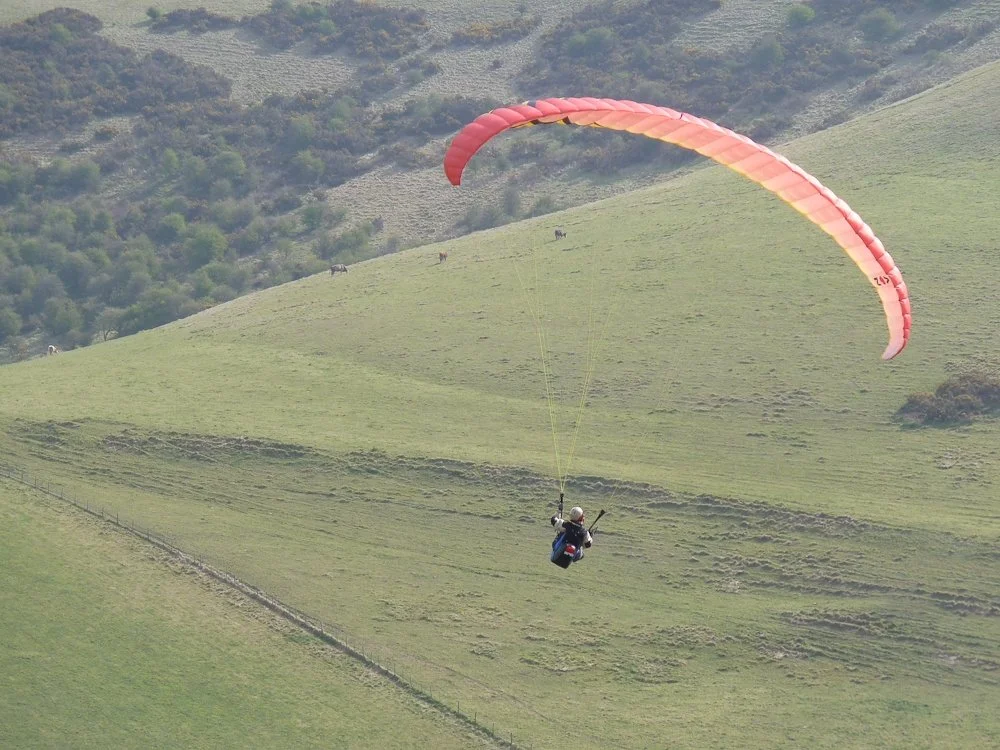 Matthew made up some porridge before leaving and I feasted on Eccles cakes and Special K bars (all the top cyclists recommend this diet) but later in the day we were to regret our lack of a good breakfast.Was late leaving Telescombe - for some reason Matthew's bike had decided to deflate a tyre overnight in the bike shed. Weather not as bright as yesterday but good weather for cycling and some notable landmarks from our high vantage points on the ridge - Ditchling Beacon (fortunately didn't have to climb it in its entirety this time!) and the Devil's Punchbowl.No-where obvious to stop for lunch and after Matthew suffered a second puncture it soon became clear we were behind on mileage today with a lot ahead of us. Matthew had his lowest point of the trip - particularly when we began to worry that we wouldn't make dinner that evening. Compared to road riding the miles tick by so slowly. On the road bike I'm knocking off at least 13 - 15 miles an hour and they soon mount up. On the mountain bike on a steep climb speeds can be down to 3 or 4 miles an hour, sometimes even less.But there are always high spots - with Brighton and Hove Albion's bright new stadium nestling in the valley to our right we stopped and watched people engaged in what can only be described as a cross between handi-gliding and kite-jumping with the 'flyer' sat in a sling, legs facing forward with a large canopy above. Looking very difficult to master and more than once a launch was aborted as the 'kite' bellowed and then fell to earth enveloping the rider in a tangle of material and cord. But when they got it right and they began to soar with the thermals the appeal was clear - turning gently skywards with the effortless ease of a buzzard. Magical.
