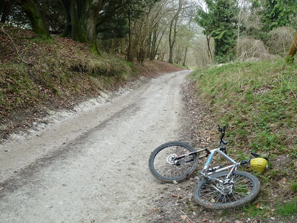 “They should call this Chalkshire” my son Matt had remarked when we'd walked the route years earlier - and he was quite right - it was everywhere as Matthew found to his cost later in the day. Wet chalk becomes incredibly slippery and when riding a little too fast down a steep incline he hit a particularly slimy patch - and he was off. I came round the bend to find him standing by his bike looking rather battered and bruised with small streaks of blood on his forehead and shins. A quick wipe down and some savlon revealed no deep cuts - but he'd taken a hard hit on his thigh and developed a bruise the size of a tennis ball. We were much more careful after that.Soon we were hunkering into another big climb (these were no surprise now) and this time it was my turn to have technical troubles - losing a bolt on the rack which had to be replaced and later a flint puncture which was so severe the tyre deflated in seconds. But the slime tyres worked a miracle - a push to the top of the and a few sessions of pumping and it eventually stayed up fine - astonishing considering the flint had even ripped a small gash in the tyre itself!