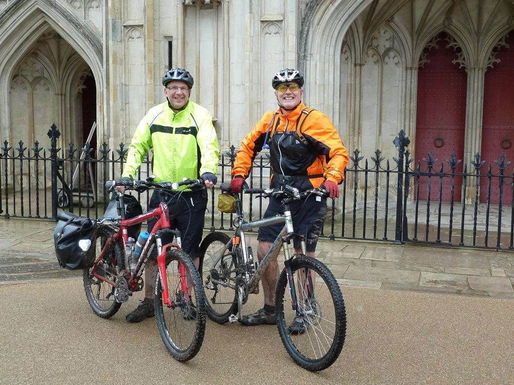 Fortunately a shortish day on the bike today - around 20 miles and a good job considering the poor conditions with continuous rain making the going very slippery at times. But both in very good spirits - few really steep climbs, although one long incline on tarmac which went on for an age! Saw a pair of buzzards today which was fantastic - something that may not even have been a possibility when Matt and I walked this six years ago.Due to the rain made very few stops today - but did pull up at a farm after about 12 miles to chat to a farmer and his father busy fettling and restoring two old Saabs - one the father had bought new in 1972 and an old (and apparently rare) combi - one of only four in the country. They also had 900 outside - at least two of the cars had done half a million miles each and the 1972 was still working for a living!The downhill approach to Winchester was welcome, but hardly scenic - alongside a busy road, the across a bridge and through the suburbs - but we ended up at the Cathedral as the bells were ringing out for Easter Monday. A quick photo from a friendly passer by and then we headed to the High Street for a hot pasty and tea and coffee (we were far too filthy to sit in a pub!) We must have looked quite extraordinary among the shoppers.Then hopped on the train back to Waterloo - a final handshake on the Embankment and Matthew headed North while I went East Headed home muddy and tired but elated. Another challenge completed successfully and a new achievement - a journey on a mountain bike.