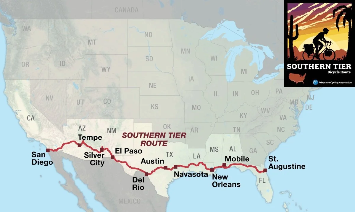 Five years after completing the TransAmerica Trail, Terry and I headed back to the States — this time to tackle the Adventure Cycling Association’s Southern Tier from St Augustine in Florida to San Diego in California. The Southern Tier is a little shorter than the TransAm — 3041.9 miles compared to 4,264 — and runs across the deep south, taking in Florida, Alabama, Mississippi, Louisiana, Texas, New Mexico, Arizona and California.