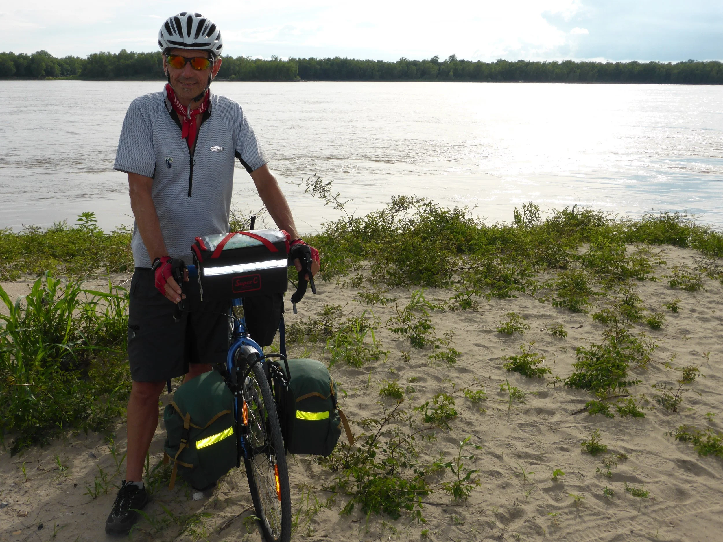 At this point on the route you've a choice of staying in the hills or riding to the Mississippi and cycling along the top of the levee. So hilly or dead flat? An easy choice, which after a few lumps and bumps landed us in a landscape which could have been the East Anglian fens. What a contrast - flat open farmland stretching on for miles, small lakes frequented by white egrets and the occasional grain silo. We couldn't believe our luck.