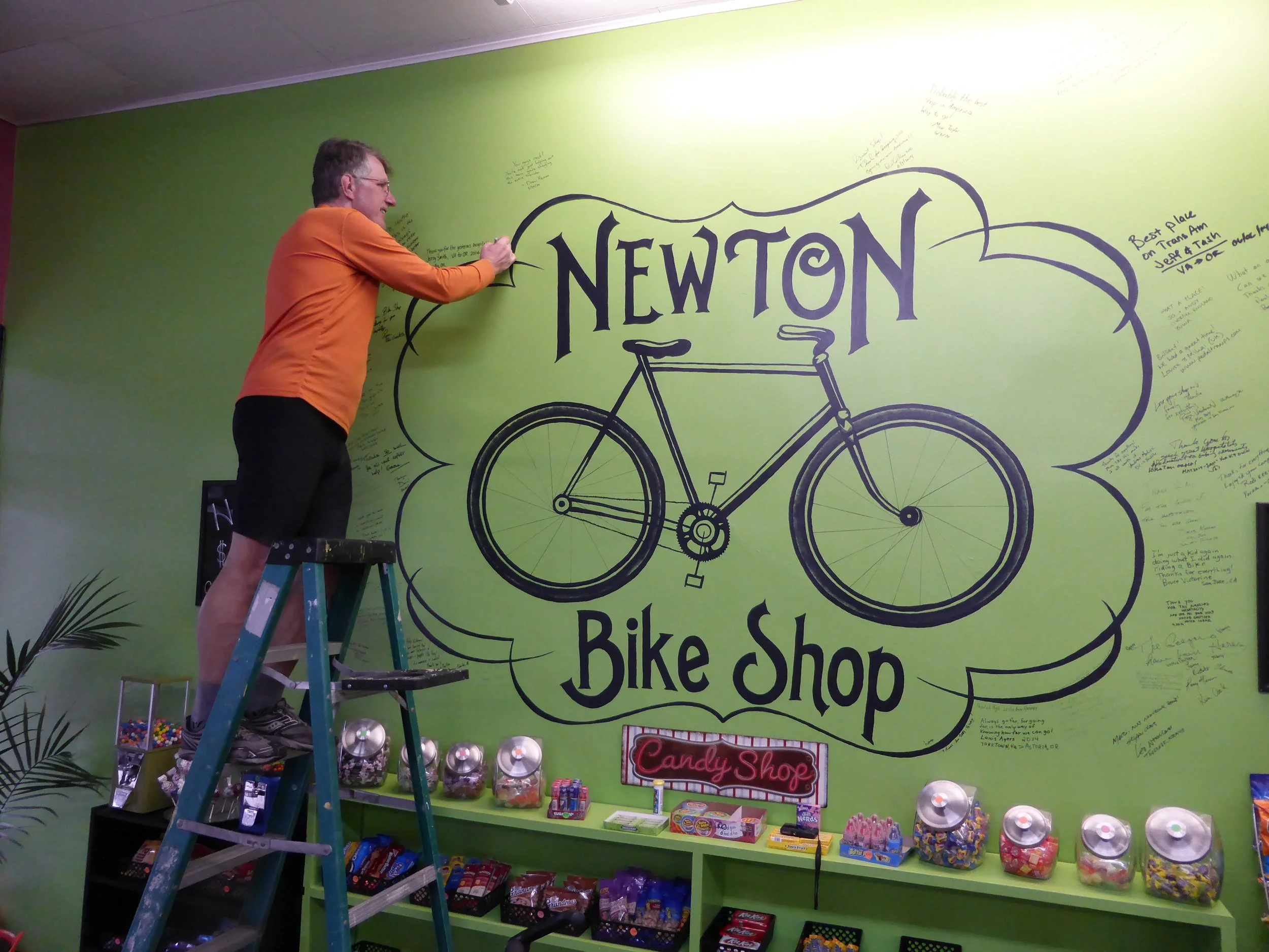 As James and his wife Heather showed us around, our jaws dropped at their incredible hospitality and trust. As James explained the reason is clear - he wants to promote the use of bikes as far as possible and the TransAm riders fit this vision perfectly. Once a record producer he is now fully committed to cycling and was preparing to take out his tandem the following day to scout parts of the TransAm route through Kansas.Pretty soon the couple are planning to add a shower to the Newton shop and open a second shop on the trail in Colorado. Before they left they handed over the front door key and that was that - they left their entire business in the hands of four cyclists they've never met before.That evening bikes were duly cleaned (Jonathan and Jerry headed to the fire station for a shower) and then we all met up at a Mexican restaurant to eat, drink and wonder at the incredible generosity we've found all along the trail - and particularly here in Newton.Today's miles: 74Total miles since first landing: 1831