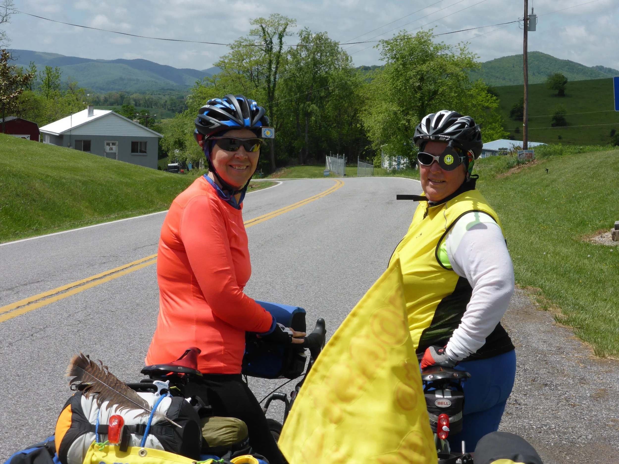 The good news is the Virginian heat wave appears to be over, for now. But in its place the temperature has dropped dramatically (we both wore jackets all day) and the hot still air has been replaced by a lively westerly - just what we don't need.Inevitably the day started with a long uphill climb. We are so used to it now we expect nothing else, the granny ring has become the default position. Jonathan and Jerry from Oregon had also been held up at Ft Chiswell so we saw them several times during the morning. At a Sugar Grove, a pretty little village in the shadow of Mount Rogers, a great gathering of TransAm cyclists happened as we joined Jonathan and Jerry and and husband and wife team Phillip and Linda Cardinal (The Surly Bike Team) who are also cycling East to West. A quick photo session followed and soon we were all on our way.