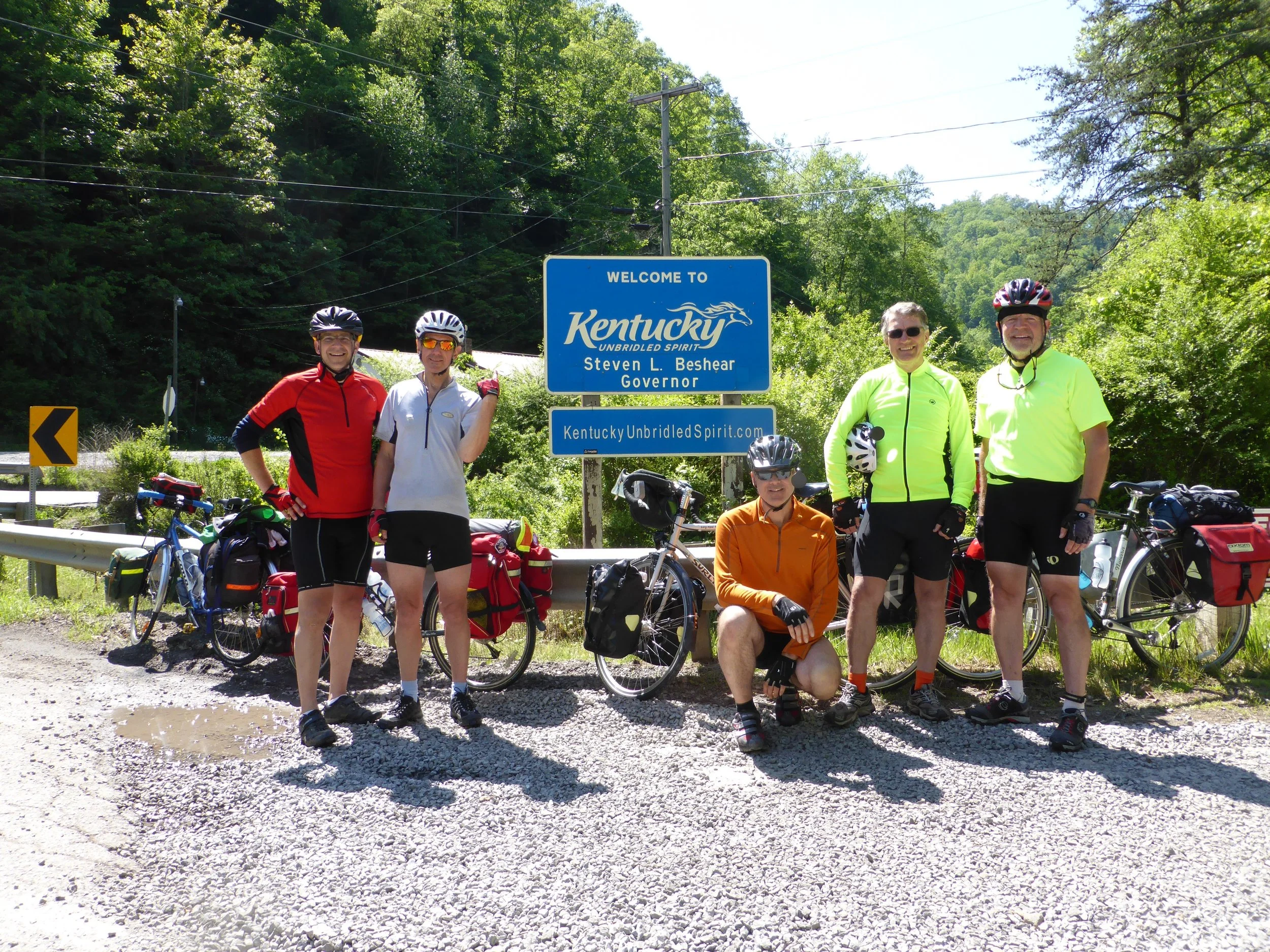 Cycling gently up the Elkhorn Creek gorge in the afternoon sun was probably the highlight of the day ... well it prompted the most 'oohs' and 'aahs' ... but it was all spoilt (for me anyway) by the dogs that Kentucky is famous for and that appeared as we hit the appropriately named Hellier. I'm really really really scared of dogs and see each one as a potential me-eater. Paul on the the other hand is much more reasonable and talks to them calmly and nicely as they run out of their yards barking (that's snarling, drooling and with teeth bared from my perspective) towards us. Every time his softly, softly approach works and we don't get mauled he tells me that's the way to do it ... until I told him later that every time he whispered sweet nothings in their ears I was blasting them with my high frequency Dog Dazer too!