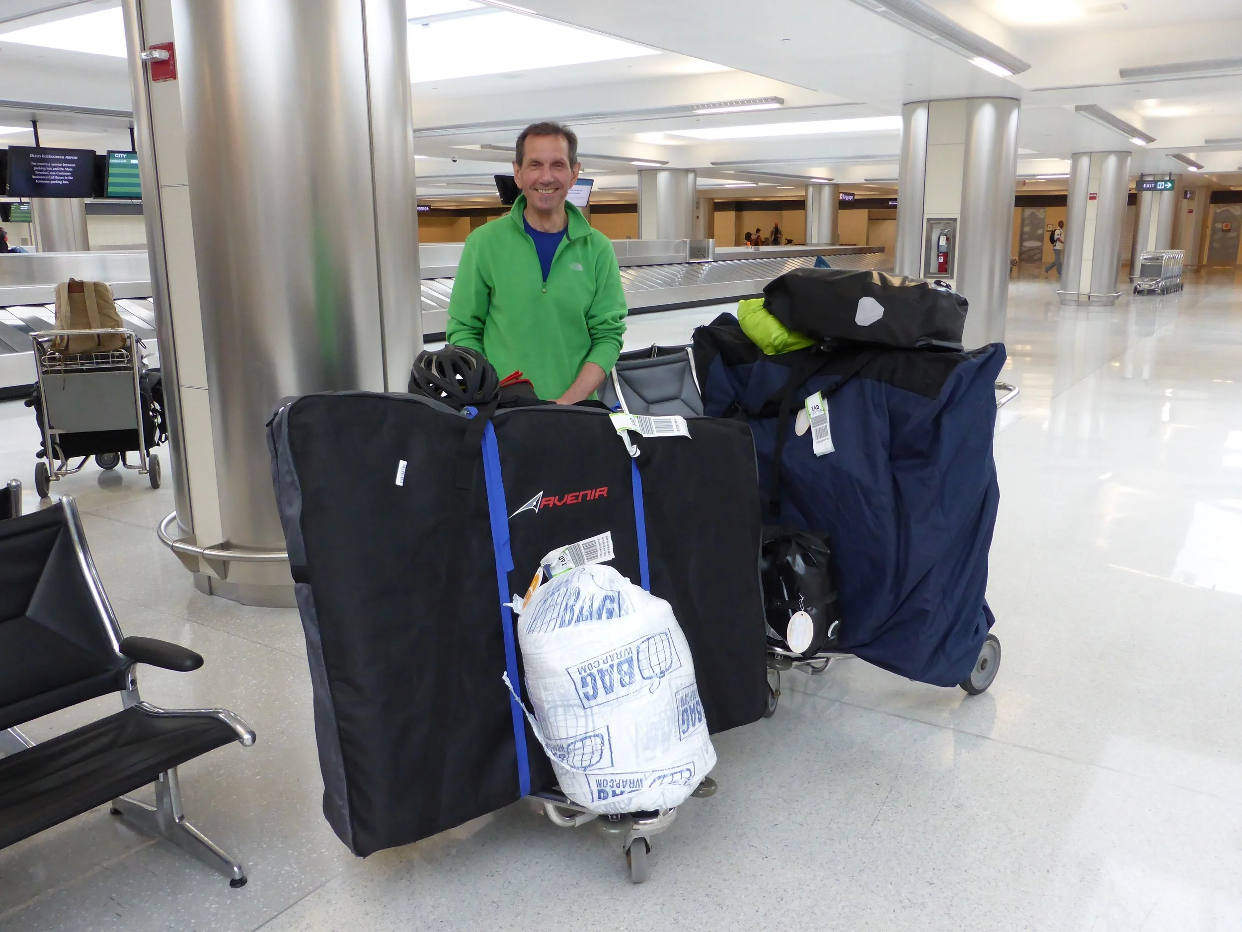 It's Day One of Terry and Paul's great cycling adventure to America and things are not going well. It's just gone 6am and we are at Heathrow unloading and re-packing our bike bags for what seems like the twentieth time. Over the past few days we've dismantled both machines (removed wheels, racks, chains, pedals and handlebars) then squeezed them into cut-down cardboard boxes which are placed inside bike bags. Any spare space around the bikes is filled with kit.