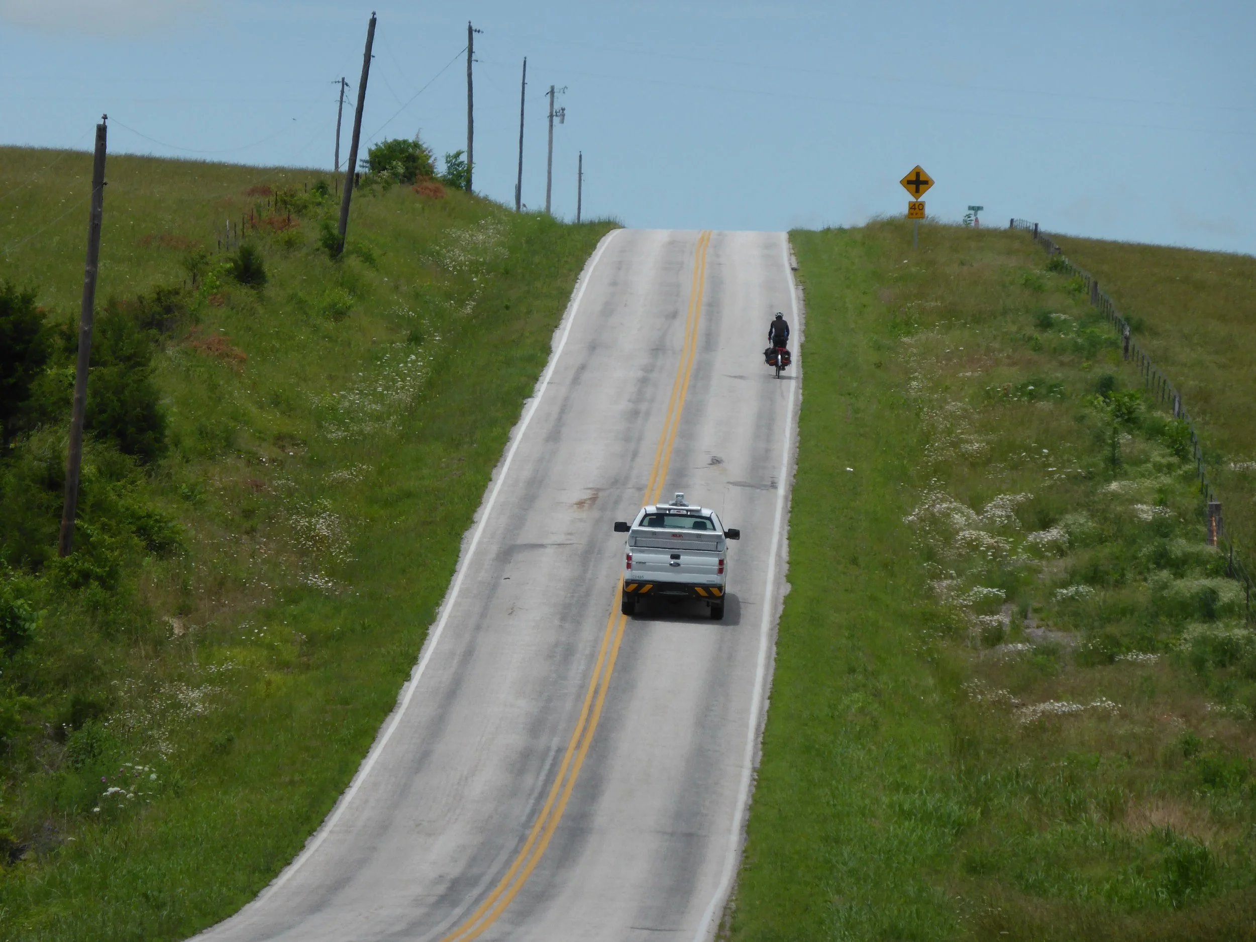 It's to do with the engineering. The roads over the Appalachians were designed with the aim of achieving the lowest gradient, so each climb is a series of switchbacks. The roads through the Ozarks in comparison just follow the contours, straight up, straight down. There's no grading here, you've just got to go with the flow. And sometimes that isn't easy. So there you go the Appalachians may win the belt, but the Ozarks will have you begging for the bell as you enter the 99th round.