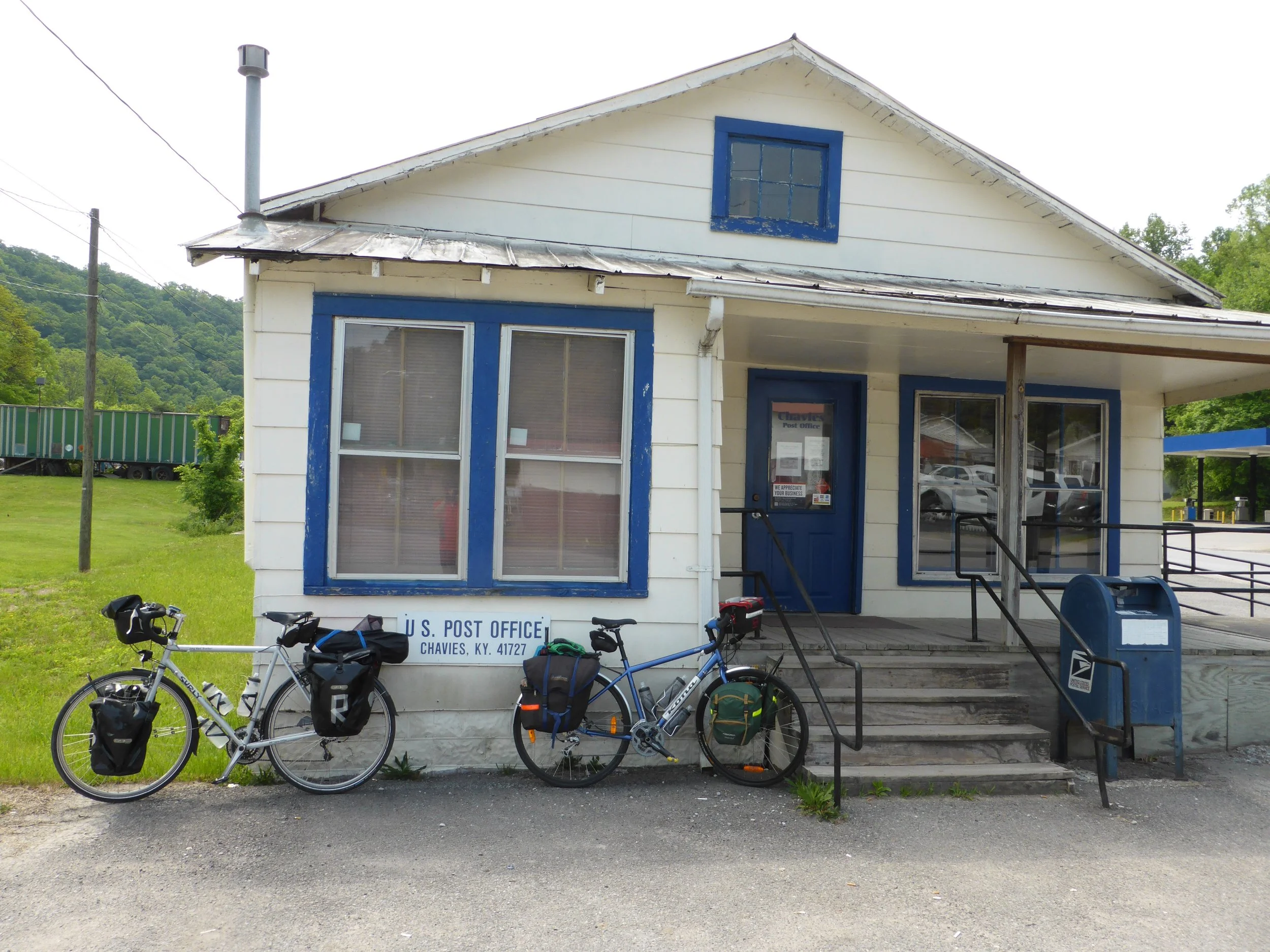The error meant we spent much of the day cycling alone. In Chavies, a simple operation to buy stamps to put on postcards turned into a major operation involving phone calls by the US postal service. Seems no one sends them anymore. We eventually met up with other cyclists in Buckhorn where we lunched. Vegetarian food is still proving tricky to find for Terry, but I enjoyed my fried catfish and hush puppies (fried corn bread balls).