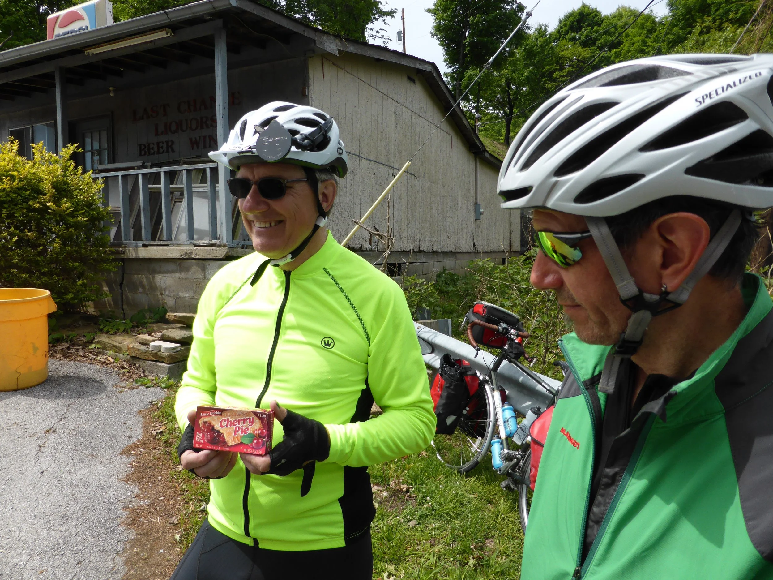 Some interesting facts learnt today. Why do cyclists have to climb so many hills in Kentucky? To tenderise the meat for the dogs. Also learnt of Jerry's special technique for climbing hills - "pie bombs". Basically eat a cherry or fruit pie half an hour before needed and the sugar rush will send you coasting to the top. I wonder if Apple Crumble would work too?
