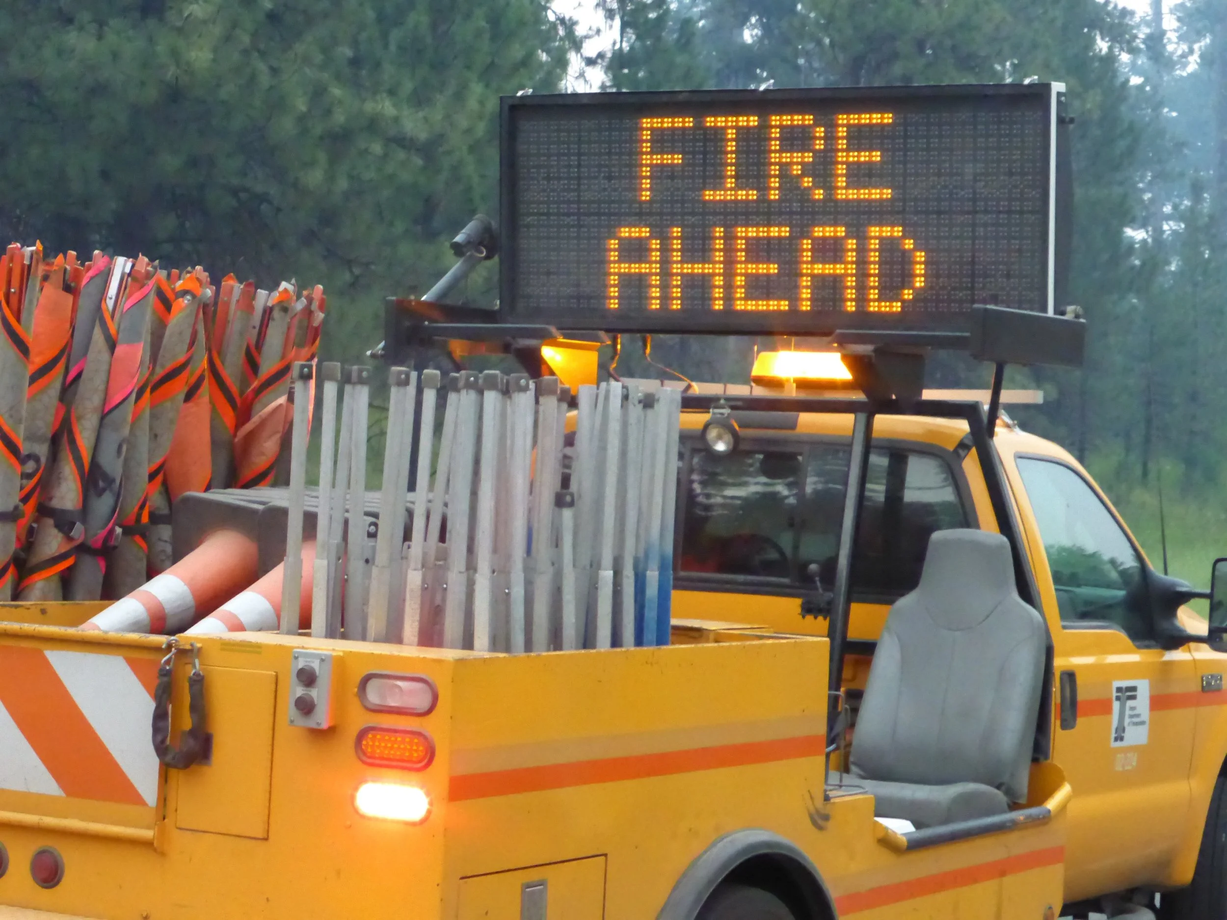 We were able to establish that Jerry and Jonathan had left their hotel in Mitchell very early that morning and from accounts by passing motorists learnt they had spent the day sitting at the roadblock up the pass, hoping to be let through. Two weary firefighters arriving in town gave us hope the pass might be open in an hour or so, so we bought extra Gatorade for Jerry and Jonathan and started our second ascent of the day. As we climbed we smelt smoke and soon we could see huge white and grey plumes rising from the ridges ahead.