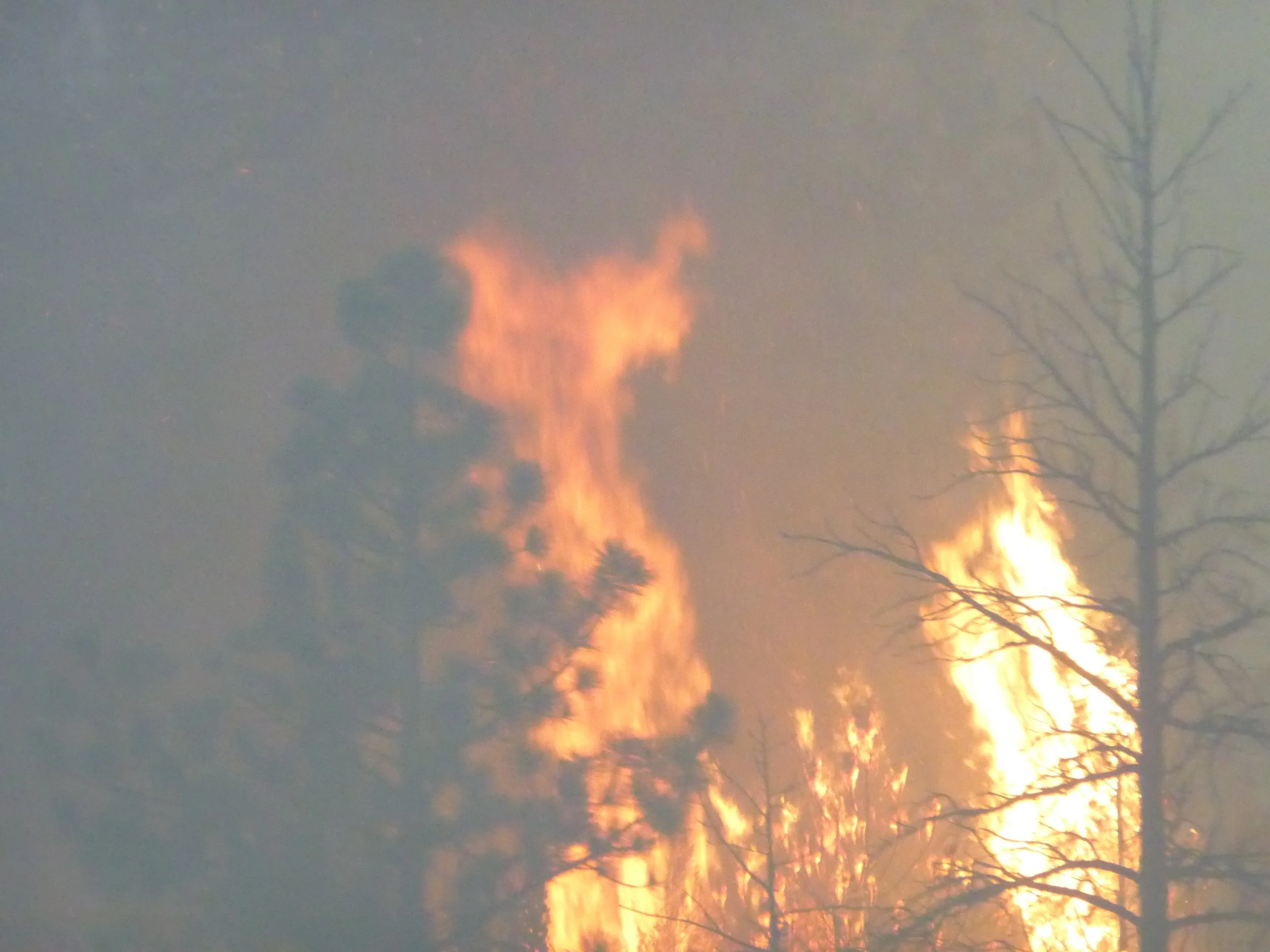 We pass blackened stands of trees and visibility is severely restricted by the smoke. To our left an entire hillside is on fire. Before long we are passing blazing trees and stumps just feet from the road. The scene is apocalyptic, a huge area of forest lost. It will take decades before the pass ever looks the same again. As the smoke thickens to a dirty grey smog the driver shuts off the ventilation and tells us not to breathe in too much! There is no way we could have cycled through this.